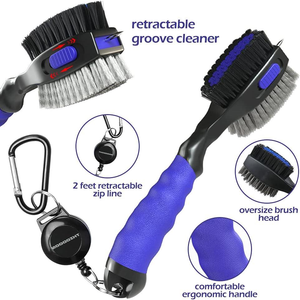 THIODOON 2 Pack Golf Club Brushes and Groove Cleaner 2 ft Retractable Zipline Carabiner Golf Brush Head with Retractable Spike Comfortable Grip Golf Club Cleaner(2pcs Black & Blue)
